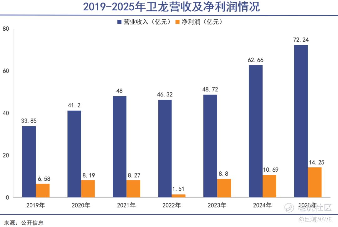 依靠两个王牌产品,卫龙业绩也保持了稳步的增长,营收从2019年 33.85亿元,翻倍增长至2025年的72.24亿元;净利润也从6.58亿元,增长到14.25亿元,同样有翻倍的表现。