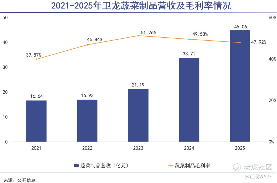 去年其蔬菜制品收入达到45.06亿元,同比大幅增长33.67%,占总营收的比重从2024年的53.79%,大幅跃升至62.38%,正式取代辣条,成为拉动公司增长的绝对主力。