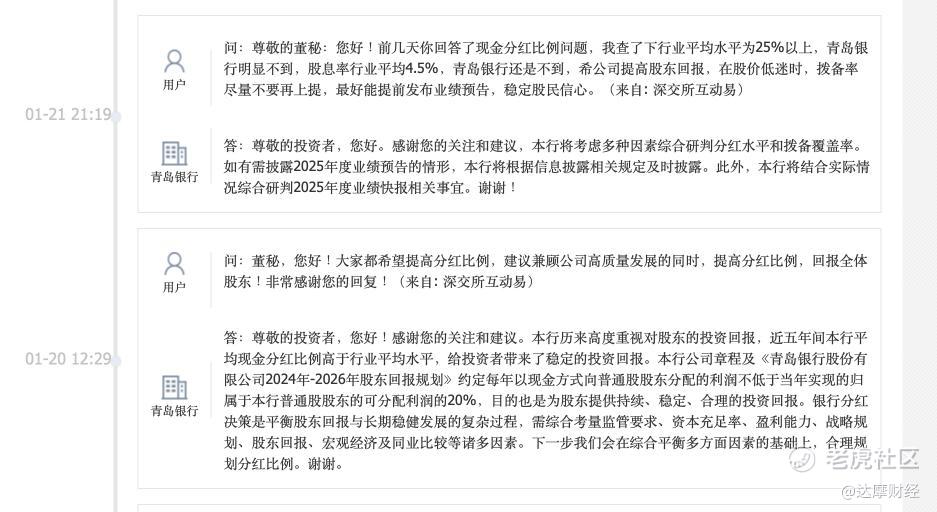 今年年初,就曾有投资者在互动易上向青岛银行董秘建议提高分红比例。彼时,青岛银行给出了“近五年间本行平均现金分红比例高于行业平均水平”的回复。
