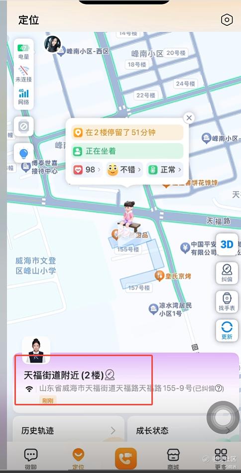 更贴心的上学守护功能,家长预设好学校和家庭地址,孩子到校、离校、到家都会自动提醒,把监护做到细致入微。这种贴合儿童场景的设计,区别于成人手表需求,也为后续楼层定位的研发埋下了伏笔。