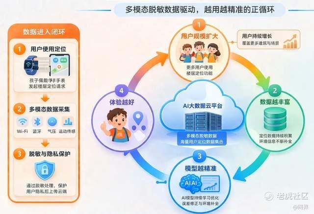 真正让小天才领先全球的,也不只是硬件传感器的丰富,也不是不只是技术架构,而是——小天才构建了一个持续自我强化的AI楼层定位大数据。所有定位数据在经过脱敏处理后,会进入云端模型进行优化。随着用户规模扩大,系统能够不断修正误差、补全环境信息