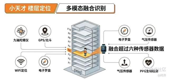 气压计仅仅是起点。为了对抗天气波动、空调系统对气压产生的扰动,小天才构建了一套多模态融合识别的楼层定位。这不再是单一传感器的读数,而是一次复杂的“多种传感器融合”(Sensor Fusion),比如现在小天才最新的楼层定位已经融合超过六种传感器数据