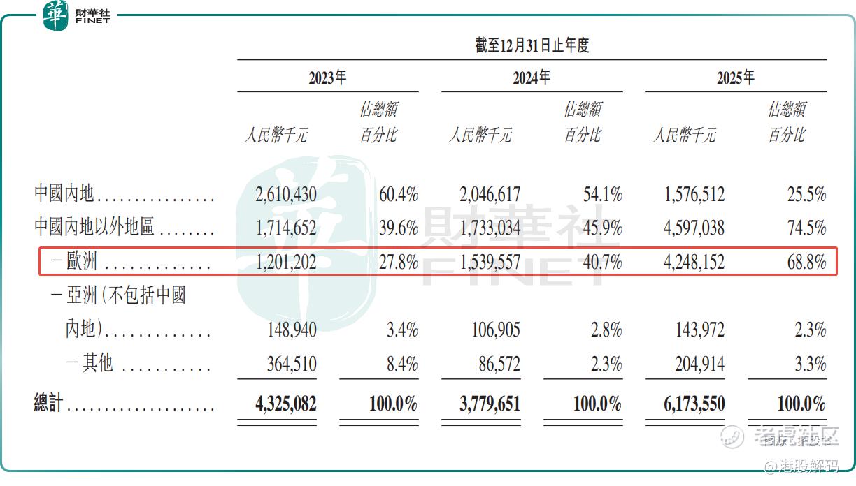 分区域来看,2023年至2025年期间,来自中国内地的收入占比从60.4%持续降至25.5%,而中国内地以外地区的收入占比从39.6%提升至74.5%,其中欧洲贡献的收入占比从27.8%飙升至68.8%。
