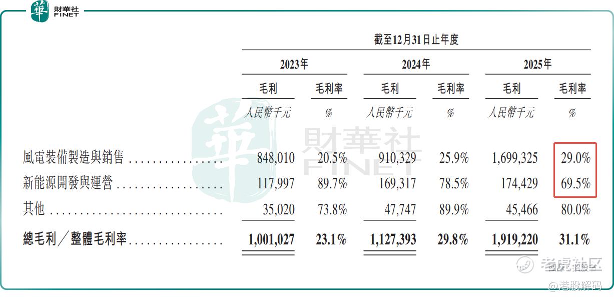 从业务结构来看,风电装备制造与销售还是大金重工的绝对核心,其2023年至2025年的收入占比分别为95.9%、92.9%、95.0%,其中2025年的毛利率增至29.0%,而新能源开发与运营的收入占比分别为3.0%、5.7%、4.1%,2025年的毛利率降至69.5%。