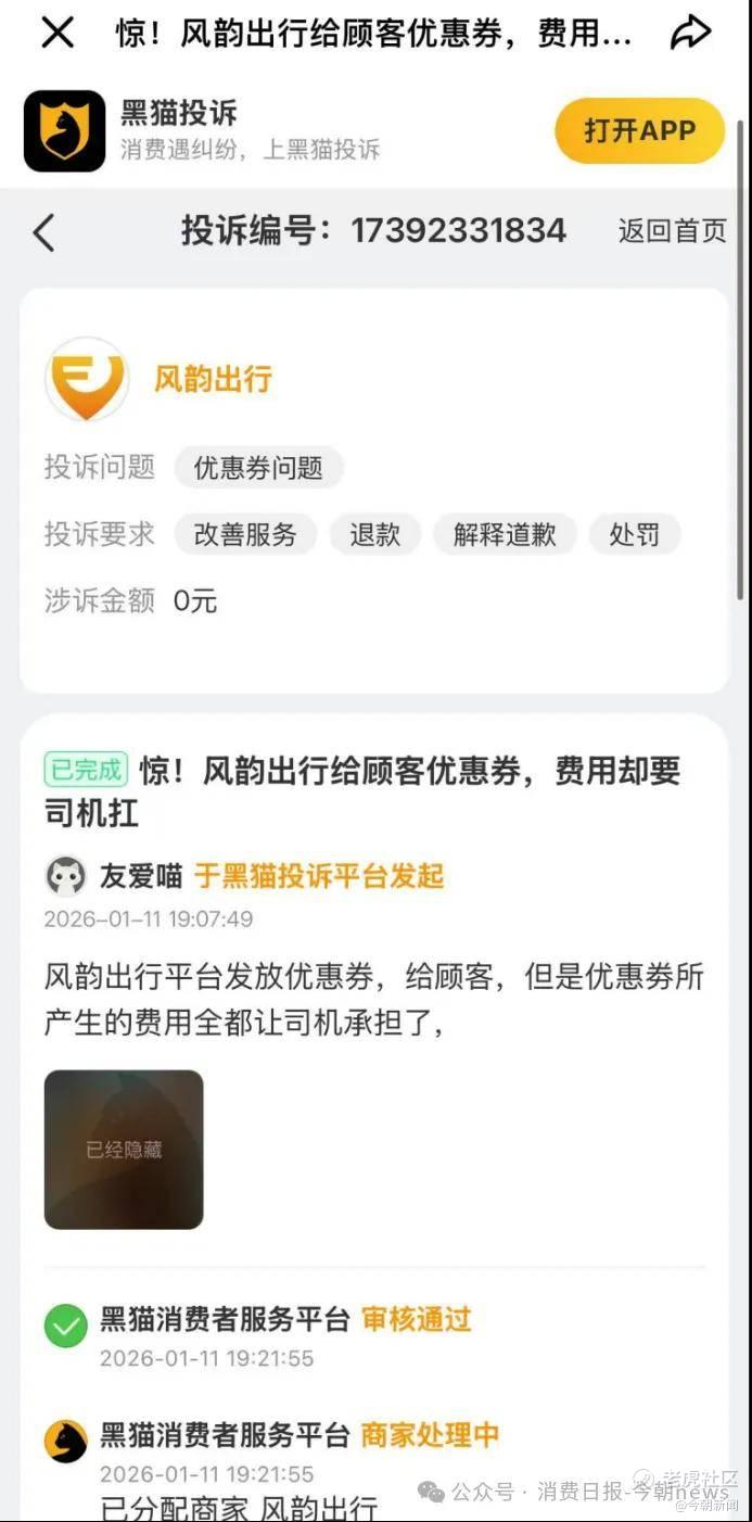 黑猫投诉平台上,有投诉称“风韵出行平台发放优惠券给顾客,但是优惠券所产生的费用全部让司机承担。”