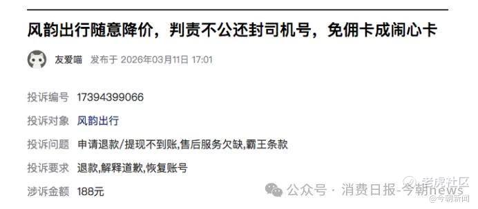 截至2026年4月9日,黑猫投诉平台上关于风韵出行的相关投诉累计超3000条,投诉焦点集中在乱扣费、提现问题、霸王条款等方面。其中有司机在2026年3月的投诉中明确表示,其买了风韵出行一周免佣卡,接单后发现,“平台随意降价,价格低得离谱,乘客所有的优惠券都是司机买单 。”
