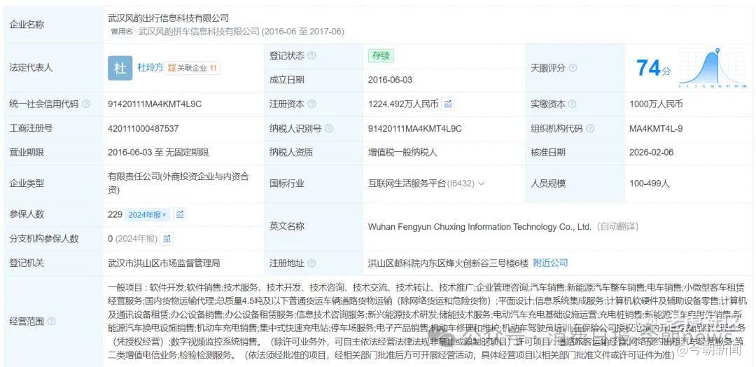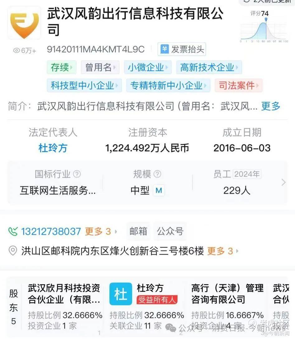 公开资料显示,涉事主体武汉风韵出行信息科技有限公司成立于2016年,注册资本1224.492万元人民币,是国家高新技术企业、湖北省专精特新中小企业。