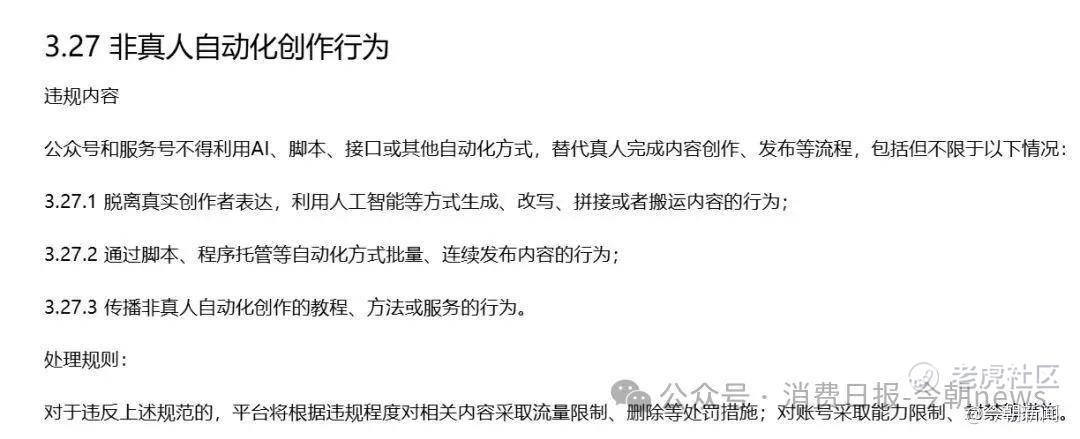 3月27日,微信公众平台新增“非真人自动化创作行为”的规定,要求公众号和服务号不得利用AI、脚本、接口或其他自动化方式,替代真人完成内容创作、发布等流程,其中包括:脱离真实创作者表达,利用人工智能等方式生成、改写、拼接或者搬运内容的行为;通过脚本、程序托管等自动化方式批量、连续发布内容的行为;传播非真人自动化创作的教程、方法或服务的行为。