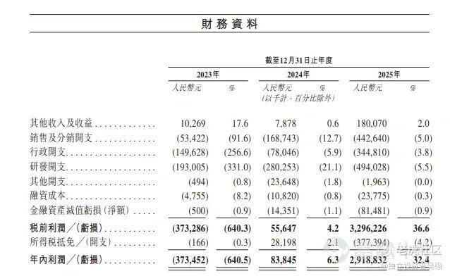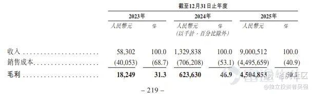 公司的收入由2023年的人民币58.3百万元增至2024年的人民币1,329.8百万元,并于2025年进一步增至人民币9,000.5百万元。2023年、2024年及2025年,公司分别录得毛利人民币18.2百万元、人民币623.6百万元及人民币4,504.9百万元,同年毛利率分别为31.3%、46.9%及50.1%。