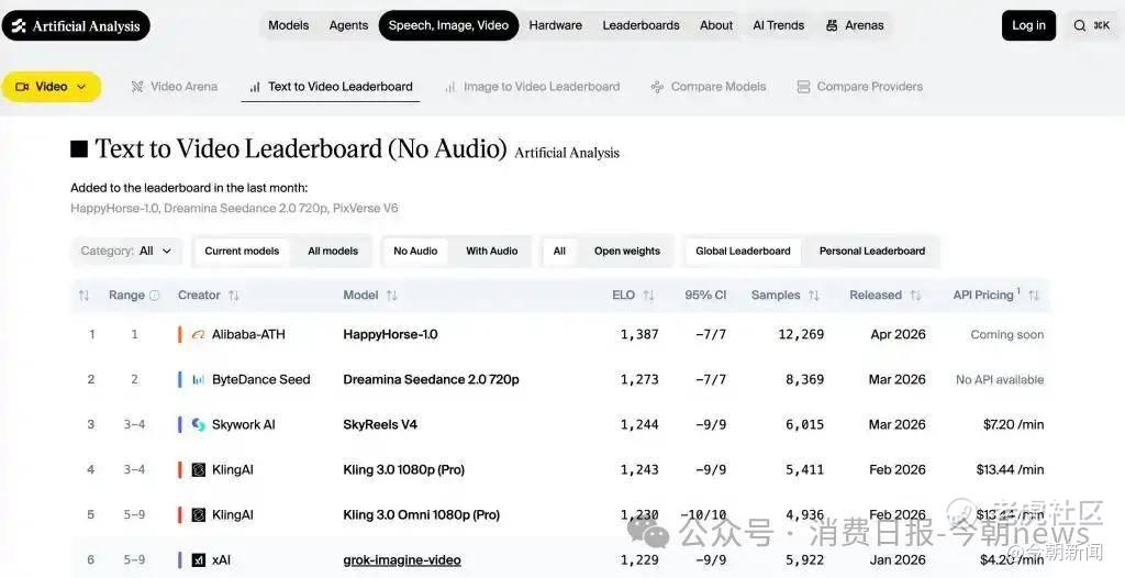 此前,在第三方AI模型测评平台Artificial Analysis公布的文生视频模型榜单Video Arena上,一个由匿名团队提交、名为HappyHorse-1.0的模型“空降”榜单榜首,超越了字节跳动旗下Seedance 2.0以及快手旗下可灵3.0等知名产品。