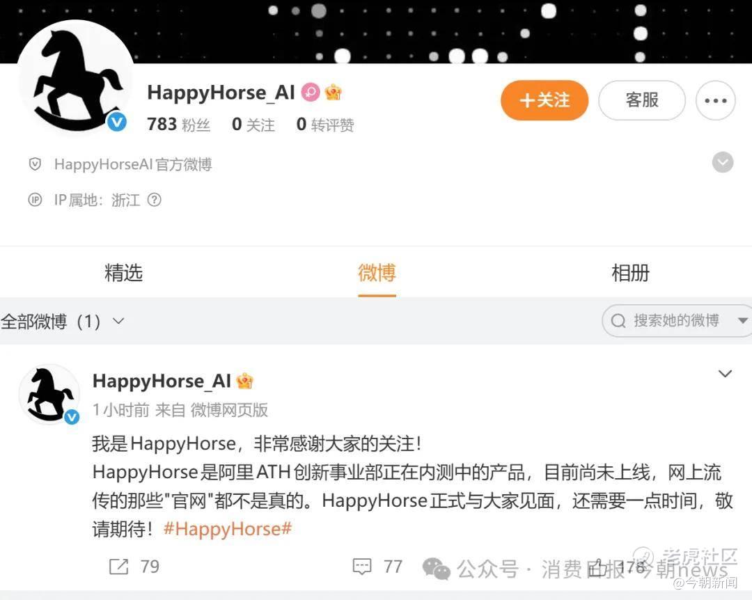 目前,HappyHorse已注册官方微博,IP属地浙江,并表示正式与大家见面,还需要一点时间。