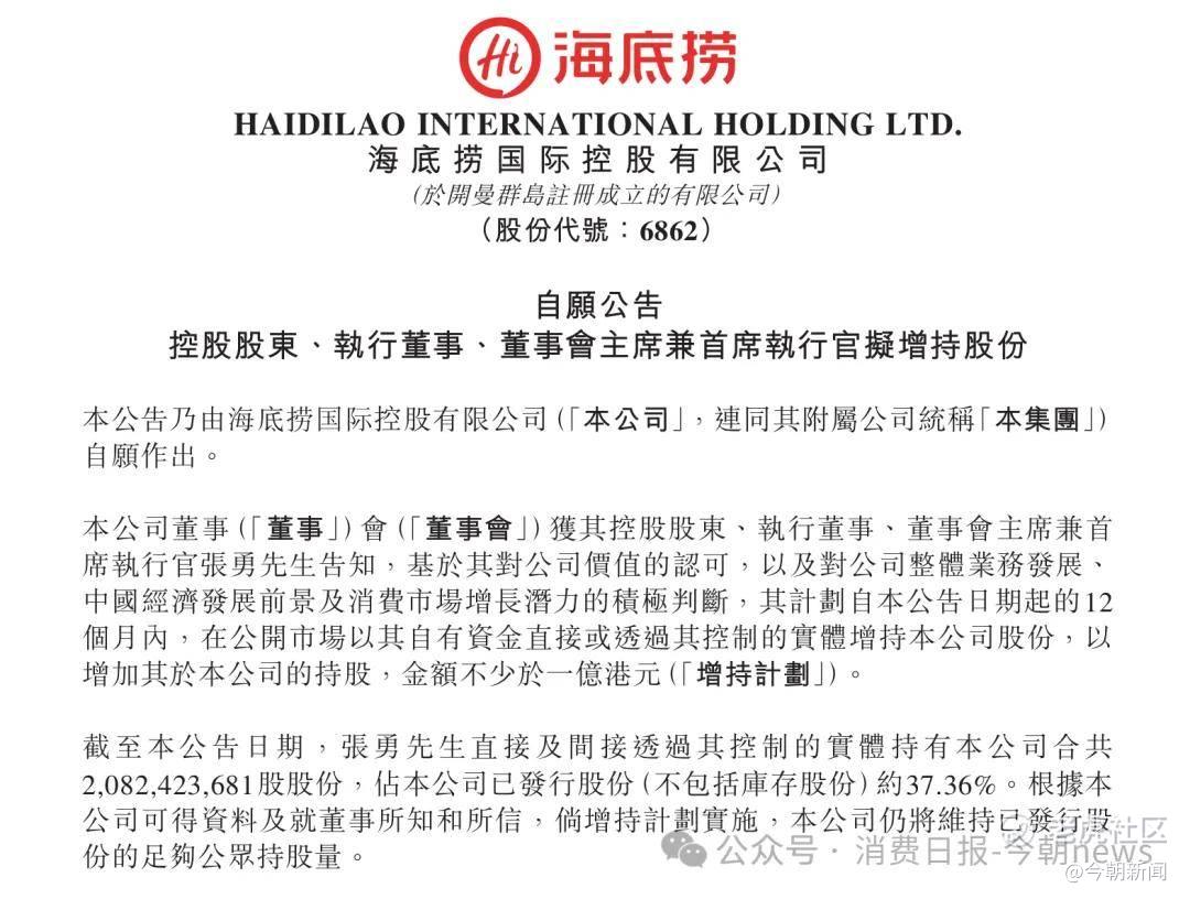 海底捞:控股股东张勇拟增持不少于1亿港元