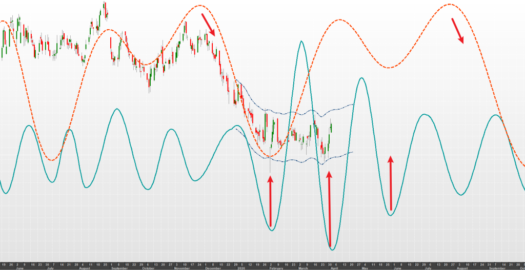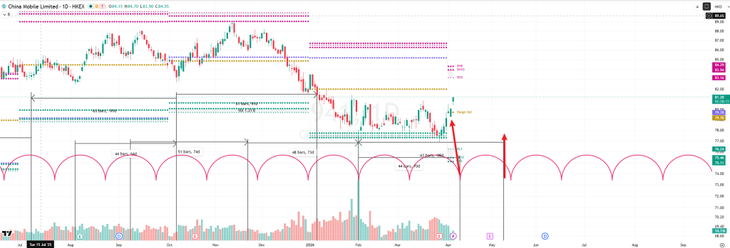 从该图表看,重要的 40周 以及 20周 周期自今年 2月2日低点 开始转上。根据模型推演,这个上升趋势预计至 7月下旬 将再度转下,对应上一个长周期高点发生在 2025 年 11 月底,其后中移动股价一路向下。直到下一个 40 周周期低点预计大概在 10月左右。