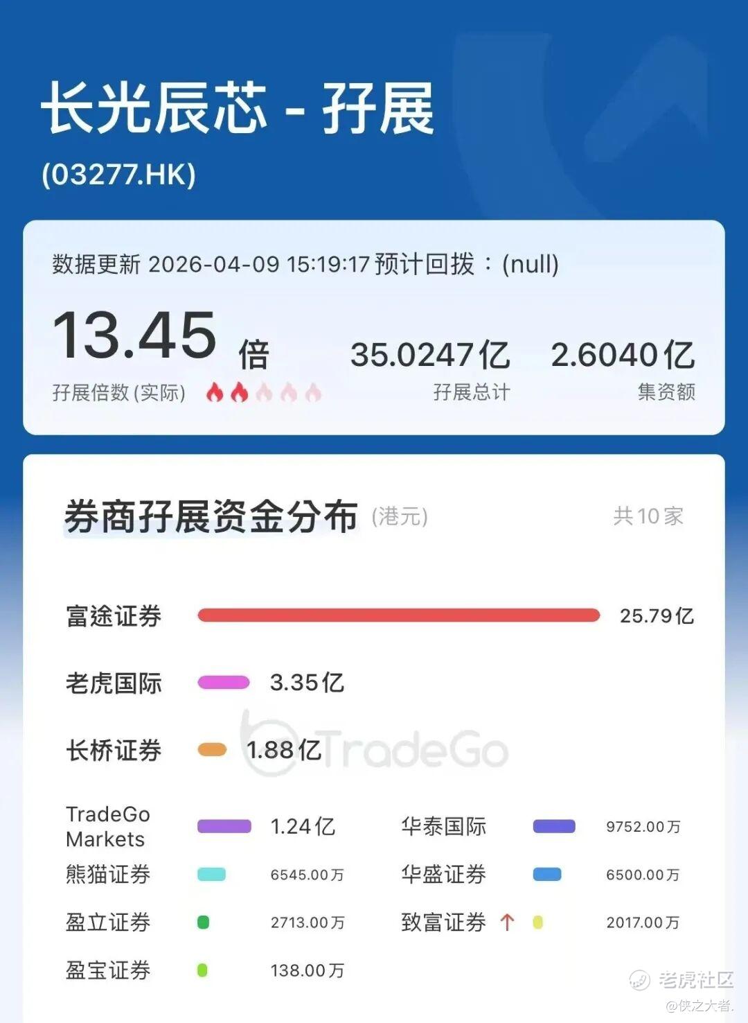 据TradeGo新股孖展数据,截至4月9日15时19分,长光辰芯孖展总额已达35.02亿港元,孖展认购倍数约13.45倍,首日认购已足额。其中,富途证券、老虎国际、TradeGo Markets分别放出25.79亿、3.35亿、1.24亿港元。