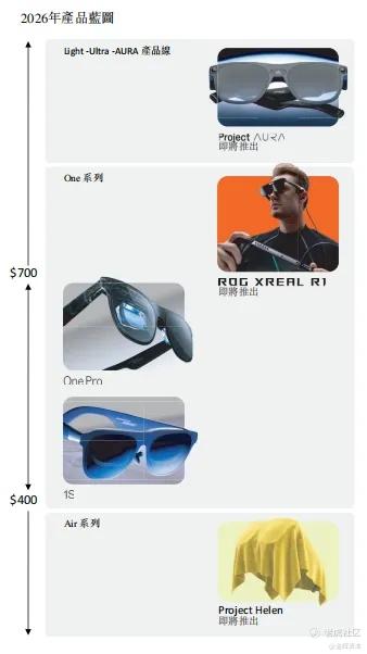 技术的突破最终落地为丰富的产品矩阵。目前,XREAL 已形成 Air 系列、One 系列、Light-Ultra-Aura 产品线三大核心系列,覆盖不同价位段与用户需求。入门级的 Air 系列兼顾佩戴体验与即插即用特性,成为沉浸式观影、移动办公等高频场景的优选,积累了广泛的用户基础;One 系列依托 Micro-OLED 显示技术、X1 协处理器与电致变色镜片,实现了显示性能与交互能力的双重升级,成为 2025 年公司第一大收入来源;而 Light-Ultra-Aura 产品线则代表着 XREAL 向下一代空间计算的演进,其中 Ultra 为开发者与高阶用户提供了完整的 6DoF 交互能力,Project Aura 更是集成了增强空间计算与多模态 AI 能力,预计将在 Google Android XR 平台运行,成为行业技术标杆。除了消费级产品,XREAL 还为企业客户提供光学模块设计、硬件开发等定制化技术服务,实现了 To C 与 To B 业务的协同发展。