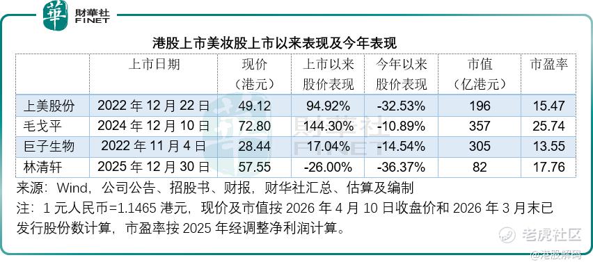 然而,港股市场的“蜜月期”似乎正在消退。回顾各家上市以来的表现,虽然上美股份、毛戈平和巨子生物在上市初期均取得了不错的涨幅,但进入2026年,市场情绪明显转冷。数据显示,今年以来,上美股份股价下跌超过32%,林清轩跌幅更是高达36%。即便是定位高端、抗跌性较强的毛戈平,今年以来也出现了超10%的回调,见下表。