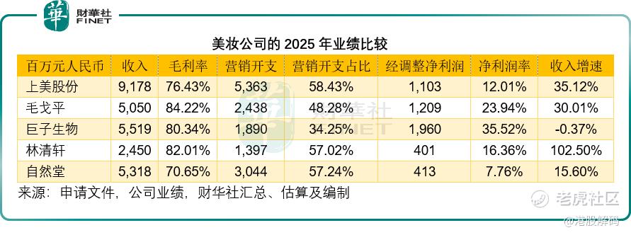 目前,港股美妆板块已汇聚了多股势力: $上美股份(02145)$ ——韩束母公司早在2022年底便已登陆港股;主打生物科技护肤的 $巨子生物(02367)$ 于2022年11月上市;高端彩妆 $毛戈平(01318)$ 于2024年底挂牌;高端植物护肤品牌 $林清轩(02657)$ 也于2025年底上市。此外,A股的龙头珀莱雅(603605.SH)和丸美生物(603983.SH)也计划赴港上市,这意味着自然堂不仅要面对已上市公司的存量竞争,还要应对潜在的新增巨头。