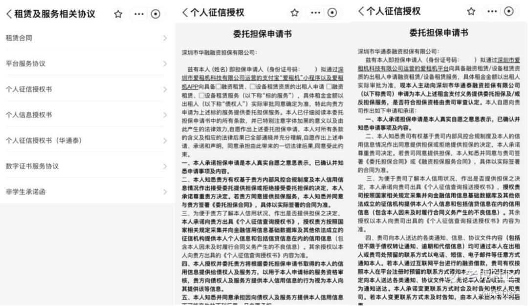 比如,在“爱租机”下单时,该平台要求用户签署《租赁协议及个人信息授权》,包括两份《个人征信授权书》,打开后其实是《委托担保申请书》,担保方分别为深圳市华融融资担保有限公司(下称“深圳华融”)、深圳市华通泰融资担保有限公司(下称“深圳华通泰”)。