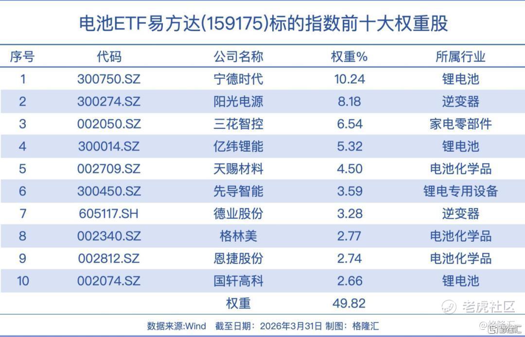 电池ETF易方达(159175)跟踪中证电池主题指数,覆盖动力电池、储能、消费电子电池全产业链,聚焦宁德时代、三花智控、阳光电源等行业龙头,其综合费率0.2%/年,为同类最低。