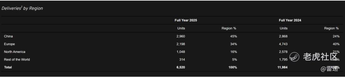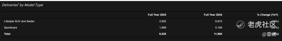 路特斯科技2025年全年交付6,520辆车,其中,生活方式SUV和轿车交付4552辆车,跑车交付1968辆车,上年一共交付11,984辆车。
