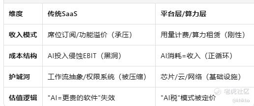 总之,AI投资主线确实正在从"软件溢价"向"算力平台+模型宿主"迁移。这不是风格切换,而是商业模式的系统性筛选。平台层(AWS、Azure、Google Cloud)逻辑最硬,软件板块需证明其Agent产品能提升ARPU/留存,否则估值承压。