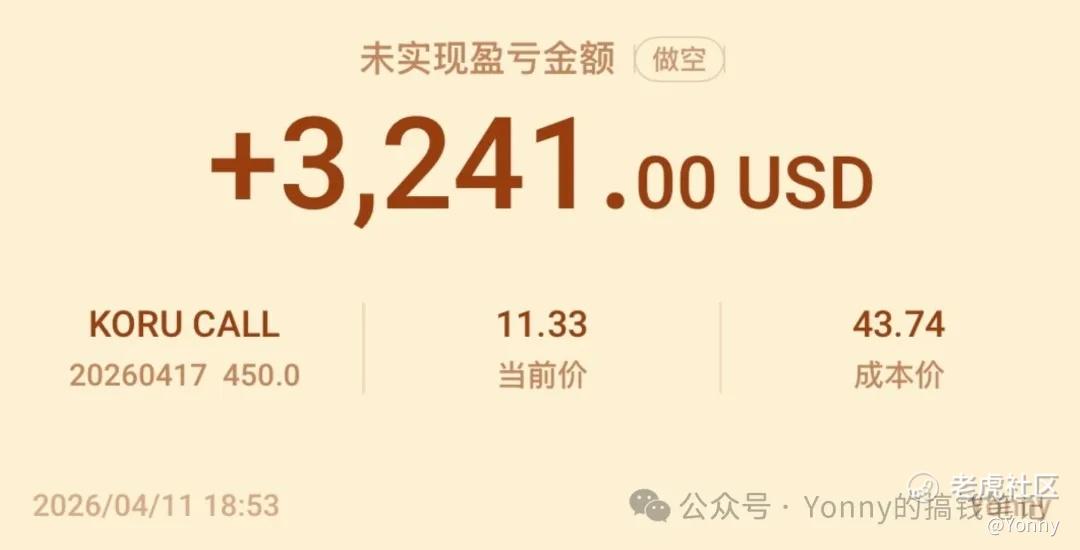 截至发稿,KORU报价$393.97,远低于450的行权价。两条腿的Delta分别只有0.282和0.136,时间价值在快速衰减中。只要KORU在4月17日前不暴涨回450以上(距离现在还有14%的空间),这个价差组合就能吃满权利金。
