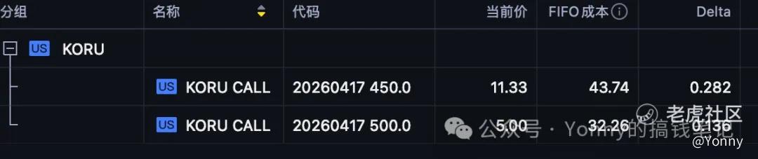 我的操作:我持有KORU的 Sell Call Spread(熊市看涨价差),卖450 CALL + 买500 CALL,4月17日到期。