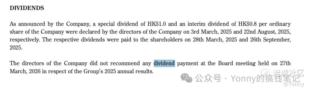 但坏消息是:3月27日刚发的FY2025年报里,白纸黑字写了"The directors did not recommend any dividend payment in respect of the Group's 2025 annual results"——FY2025不派息,也就是说管理层确认了3月份是不会有派息的。