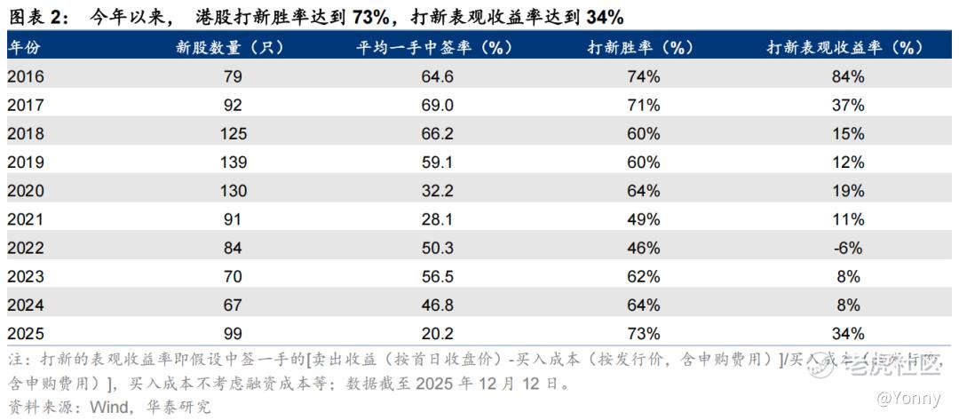 根据华泰证券的研报,2025年港股打新的中签后胜率达到73%,表观收益率34%,比2024年的64%胜率和8%收益率有了质的飞跃。2026年预计全年融资额将达3000亿港元,约160只新股上市,大票也不少。