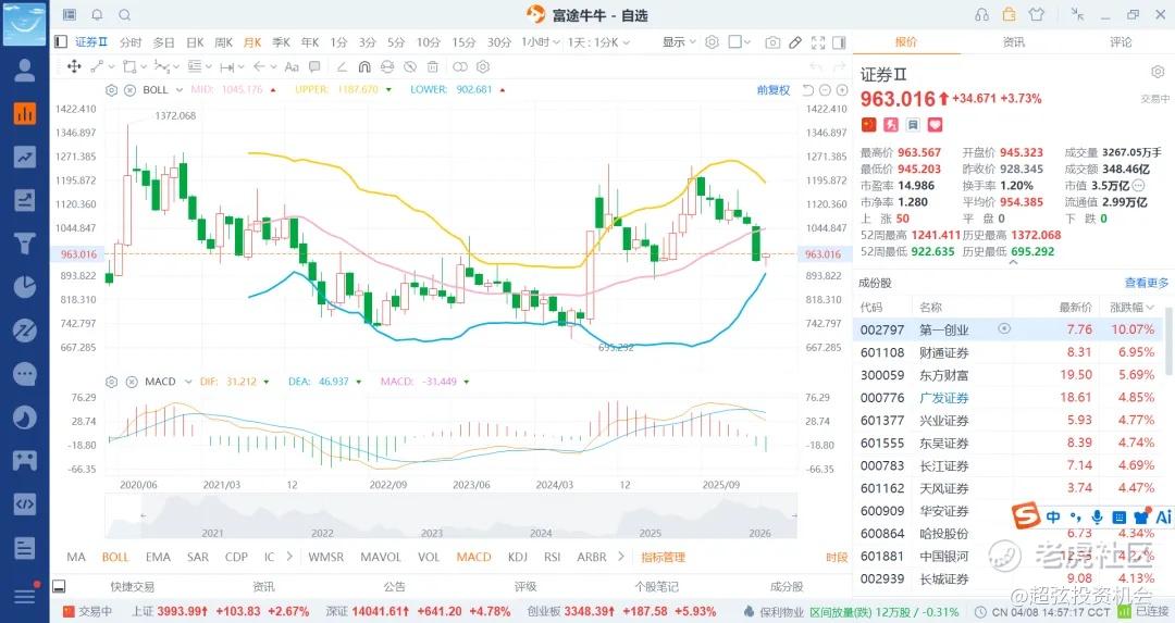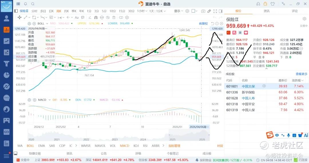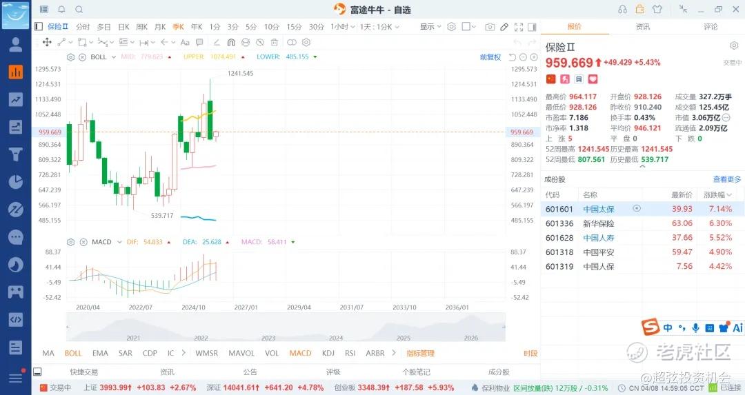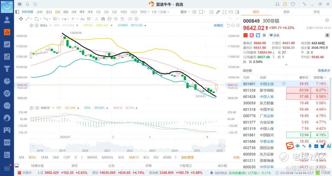 科技股现在老美还是高位,不太好说,那么就退而求其次了,跌的够多了郭嘉対就来了,他会买什么板块呢,自然是金融了,但银行比较高了,自然会买低位的非银了,也就是证券和保险了,所以这里购买部分底仓,或者是定投中期看是不会吃亏了,就是买跌不买涨就行了,给到就买,不给就算了,基本面没啥看的了,保险的业绩还不差,牛市的证券也还行,但是就是不能追高罢了。