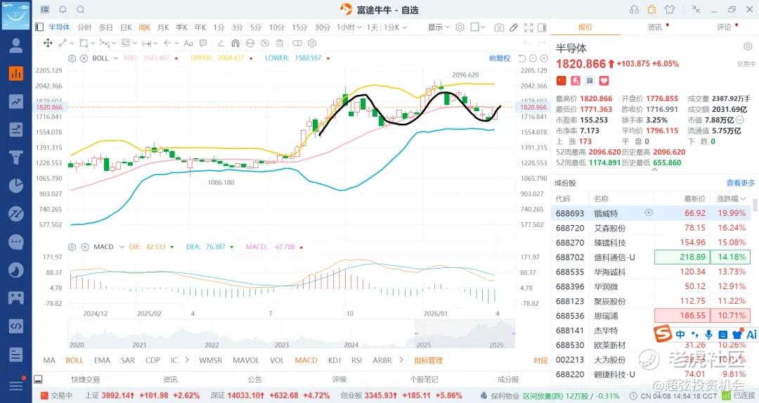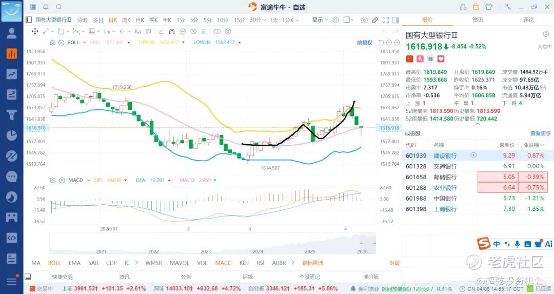 之前是科技高位震荡,资源持续的上涨,非银持续的调整,不过银行到是持续的走高护盘模式,当然是四大行了。