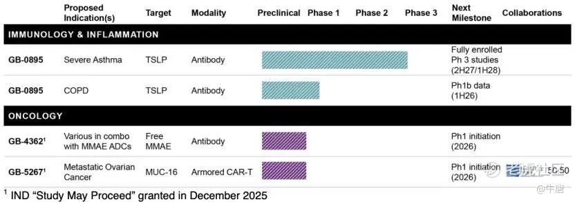GB-0895:一款长效抗TSLP单克隆抗体,用于治疗严重哮喘、慢阻肺等。TSLP(一种上皮细胞因子)是多种炎症级联反应的关键上游细胞因子,在哮喘、特应性皮炎、慢性鼻窦炎等过敏性疾病中发挥核心作用,并且已经是重度哮喘临床和商业验证的靶点。