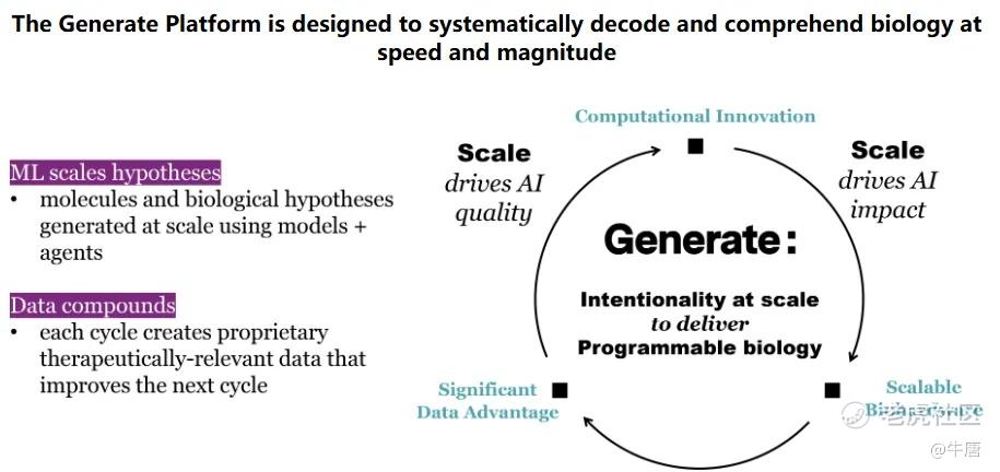 而Generate则不再满足于“发现”药物,而是要“生成”药物 。公司通过一个紧密集成的“设计-构建-测试-学习”循环,不断产生专有的、具有治疗意义的数据,并形成可重复应用的模块化能力,以此降低药物开发的时间和成本,提高成功率。为此,公司组建了两个技术平台: