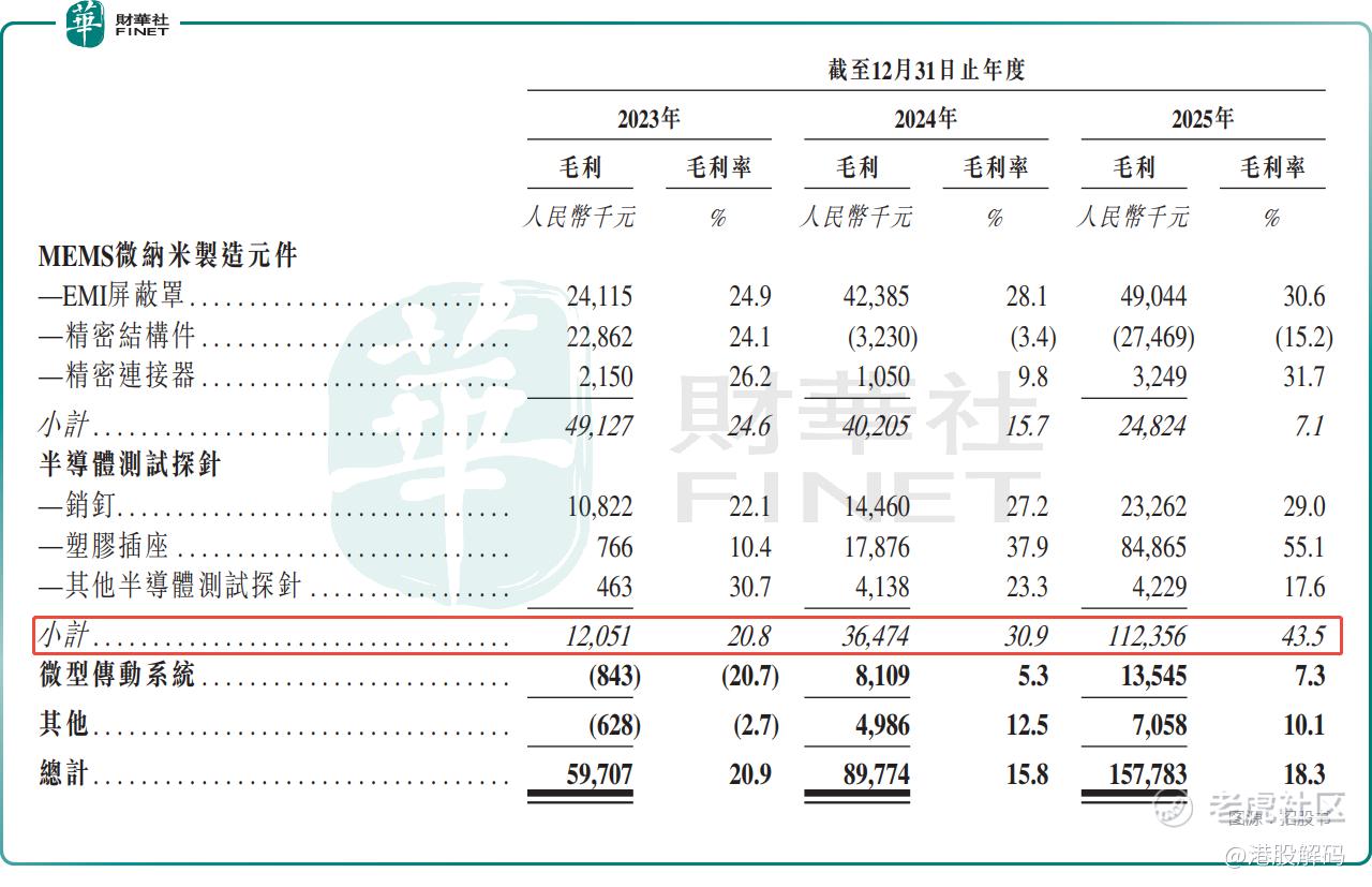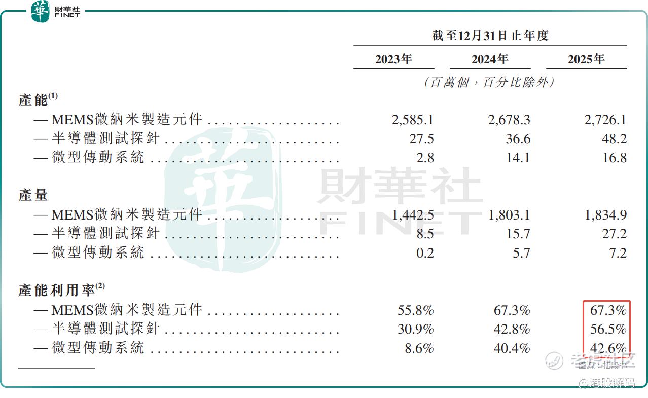 值得注意的是,根据招股书披露,其实2025年公司三大业务的产能利用率均未饱和:MEMS微纳米制造元件为67.3%,半导体测试探针持续提升至56.5%,微型传动系统仅为42.6%。