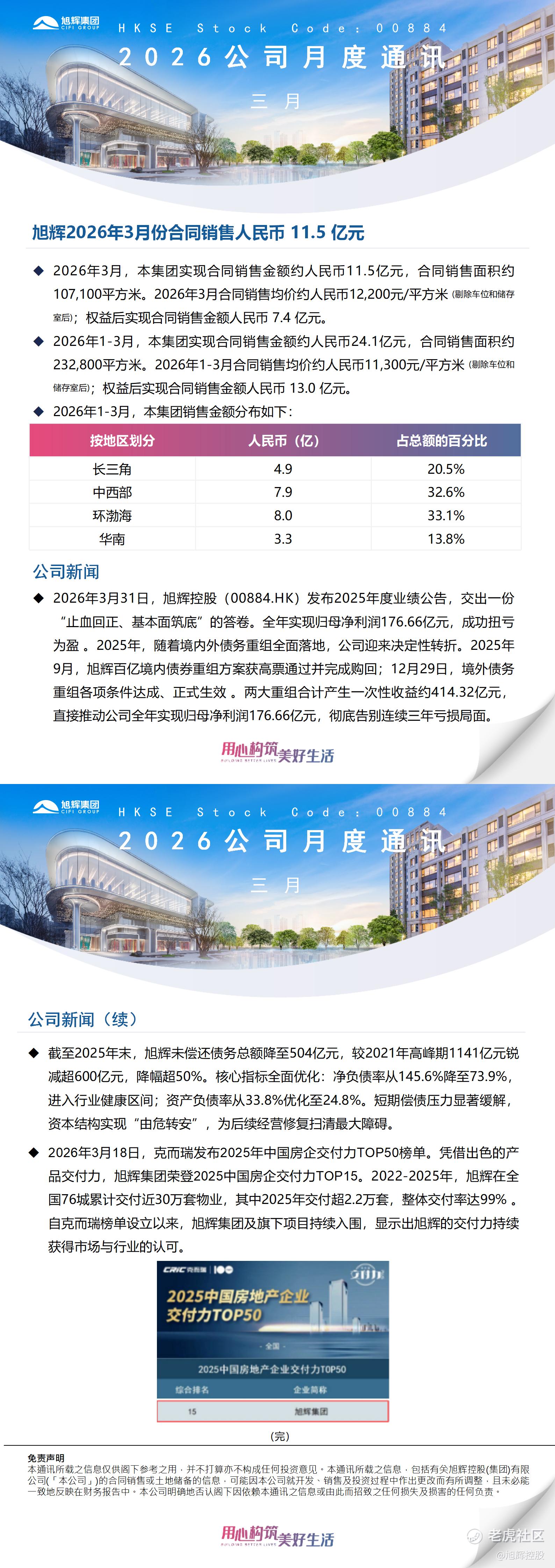 销售业绩:2026年3月,旭辉集团实现合同销售金额约11.5亿元,销售面积约107,100平方米,均价约12,200元/平方米(剔除车位及储存室后)。1-3月累计实现合同销售金额24.1亿元,面积232,800平方米,均价11,300元/平方米,权益后销售额13.0亿元。