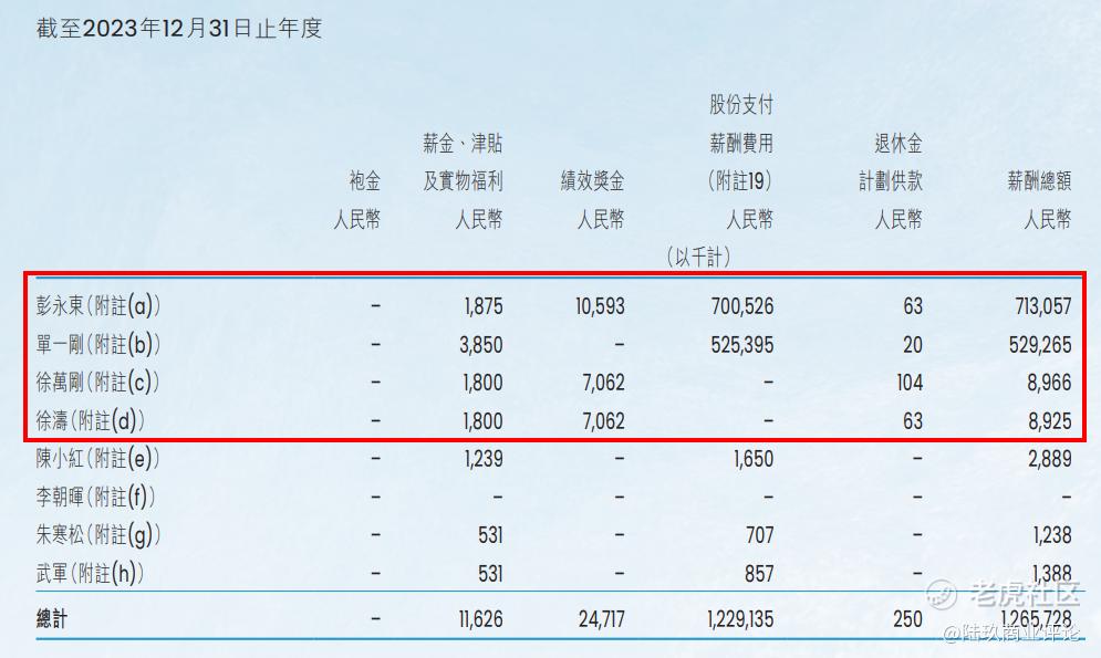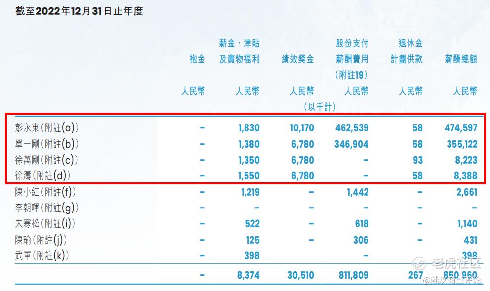 2022年,彭永东的薪酬为4.75亿元,单一刚的薪酬3.55亿元(22年起,这两位的包含股份支付,下同)徐万刚的薪酬为822.3万元,徐涛的薪酬为838.8万元。