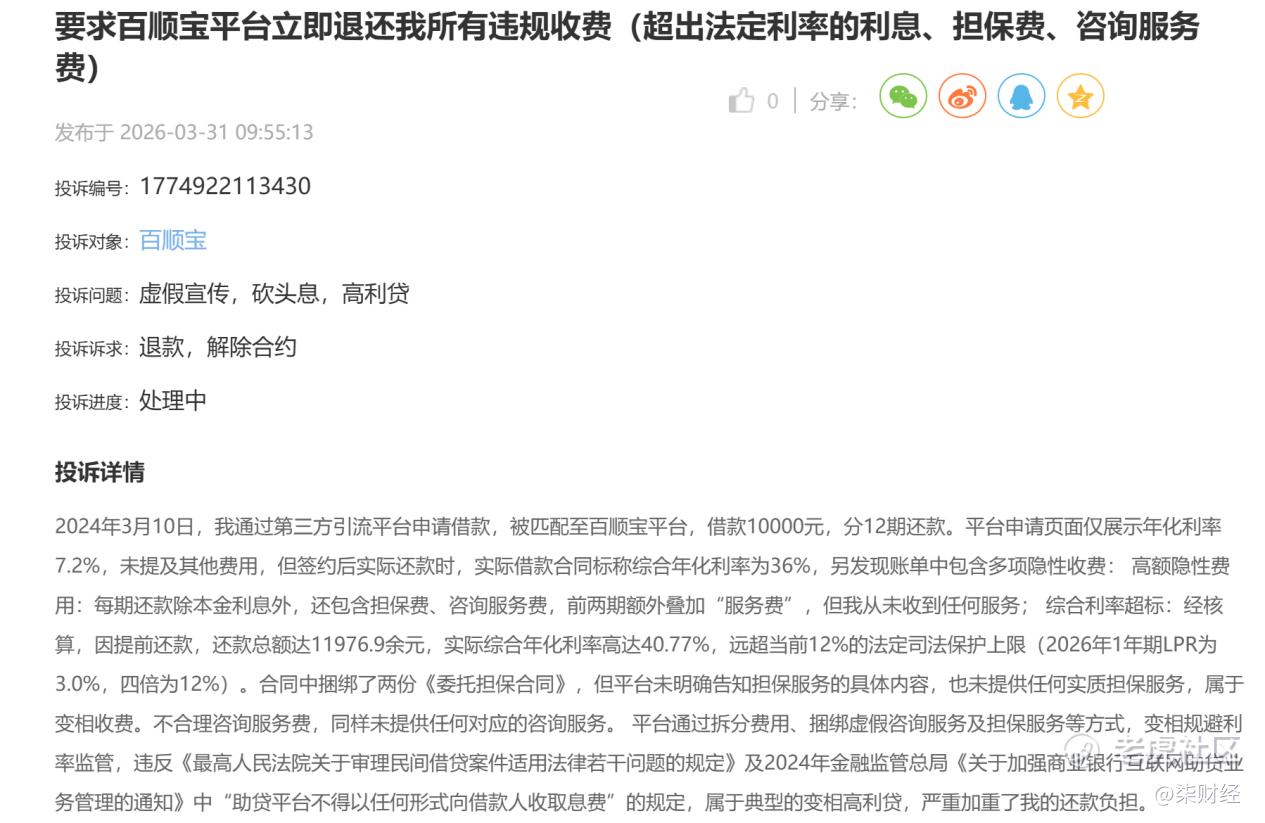 一位用户表示:“通过第三方引流平台申请借款,被匹配至百顺宝,借款10000元,分12期还款。平台申请页面仅展示年化利率7.2%,未提及其他费用,但签约后实际还款时综合年化利率为36%,另发现账单中包含多项隐性收费:担保费、咨询服务费等。经核算,实际综合年化利率高达40.77%……”
