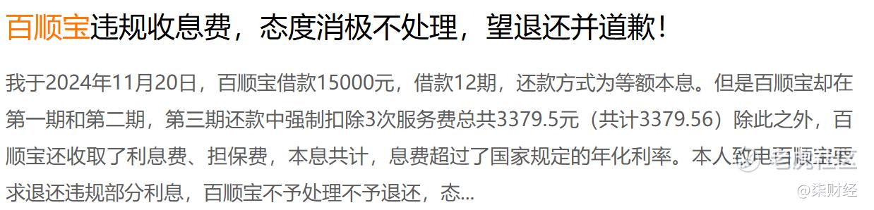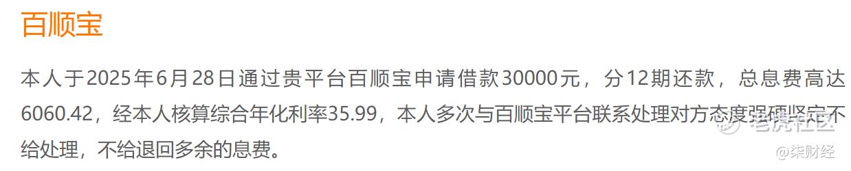 比如,有用户写到:“通过百顺宝申请借款30000元,分12期还款,总息费高达6060.42,核算综合年化利率35.99%……”
