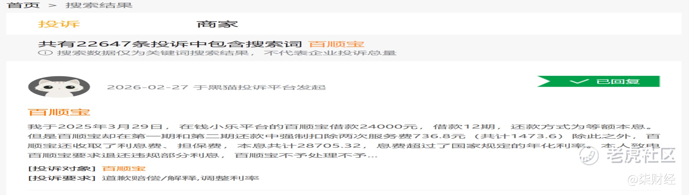 黑猫投诉上,以“百顺宝”为关键词,出来的搜索结果超过2.26万条,大量用户反映其利用会员费、担保费等手段,变相提高贷款成本,增加借款人负担,且存在泄露隐私、暴力催收等问题。