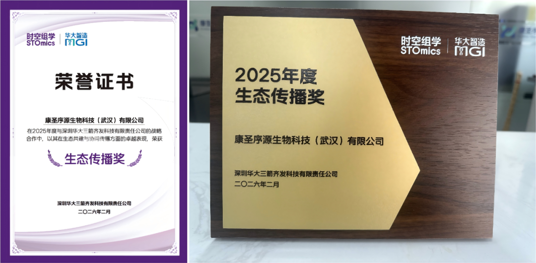 近日,在时空组学领域年度生态伙伴评选中,康圣序源生物科技(武汉)有限公司(以下简称“康圣序源”)凭借在基因多组学的技术推广、科研服务创新及行业生态建设中的突出贡献,荣获2025年度"生态传播奖"!