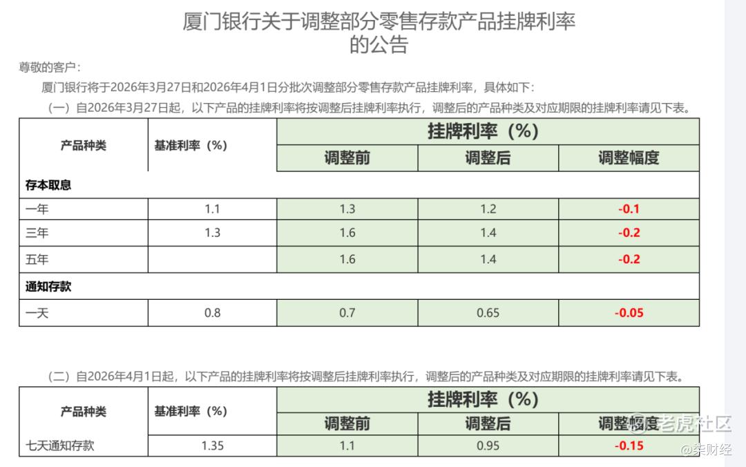 福建海峡银行则对协定存款和通知存款利率同步调降。4月1日起,协定存款利率(福建省)下调5个基点至0.6%;一天期、七天期通知存款利率(福建省)分别下调10个、20个基点至0.6%、0.9%。