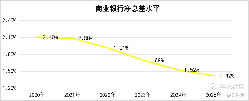 据国家金融监督管理总局披露的数据,近些年商业银行净息差一路寻底,截止2025年四季度末为1.42%,已然低于1.8%的行业“警戒线”。