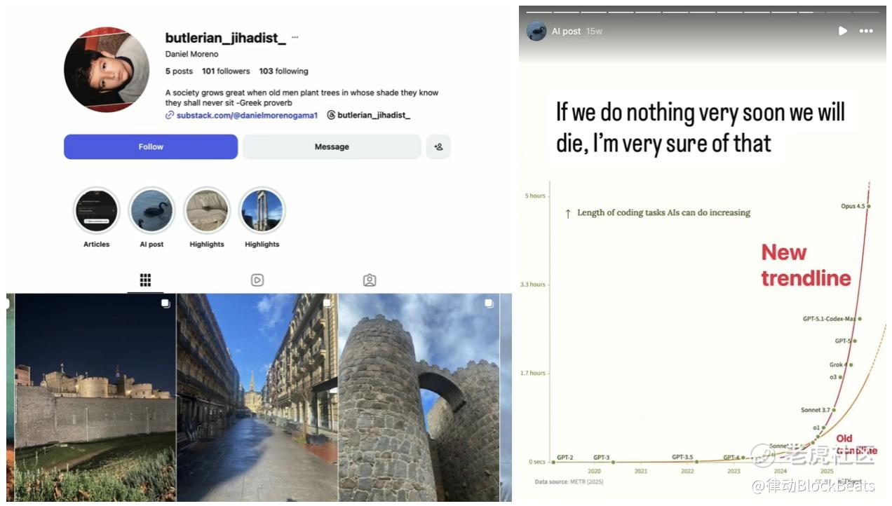 第一起案件的嫌疑人 Daniel Moreno-Gama 是位 AI 悲观主义者。他在社交媒体上引用《沙丘》中人类对抗机器的主题,写文章论证 AI 对齐失效构成存亡级风险,批评科技领袖为追求「超人类主义」而「拿全人类命运豪赌」。