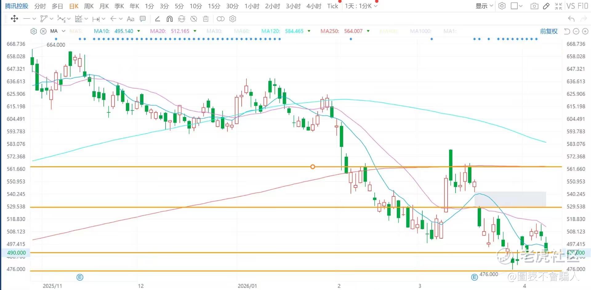 腾讯控股(0700.HK):收跌2.87%,这段时间一直动荡下行,因为加大 AI 投入致使回购力度减弱,加上动乱频繁,支撑参考473/488,阻力参考529/563