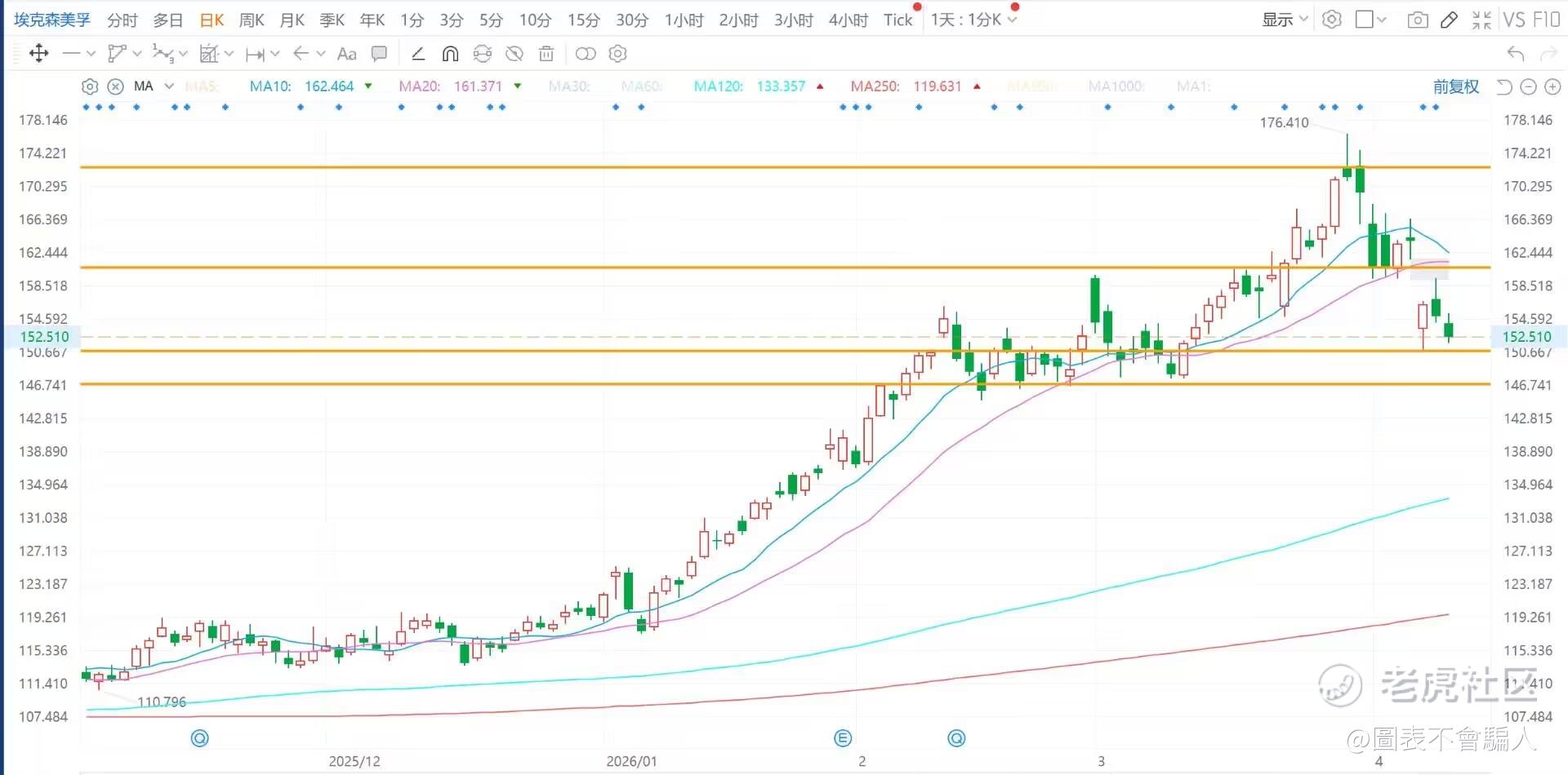 埃克森美孚(XOM):收跌1.63,盘前涨2.09%,直接受益中东冲突再起、油价上行,支撑参考146/150,阻力参考160/172