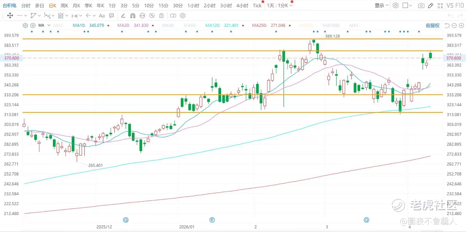 台积电(TSM):收涨1.40%,触到阻力位,盘前跌0.58%,季度营收和利润增加产生利好,不巧遇到美伊关系变动,这周四出财报,看看后续怎么发展,支撑参考315/333,阻力参考377/389