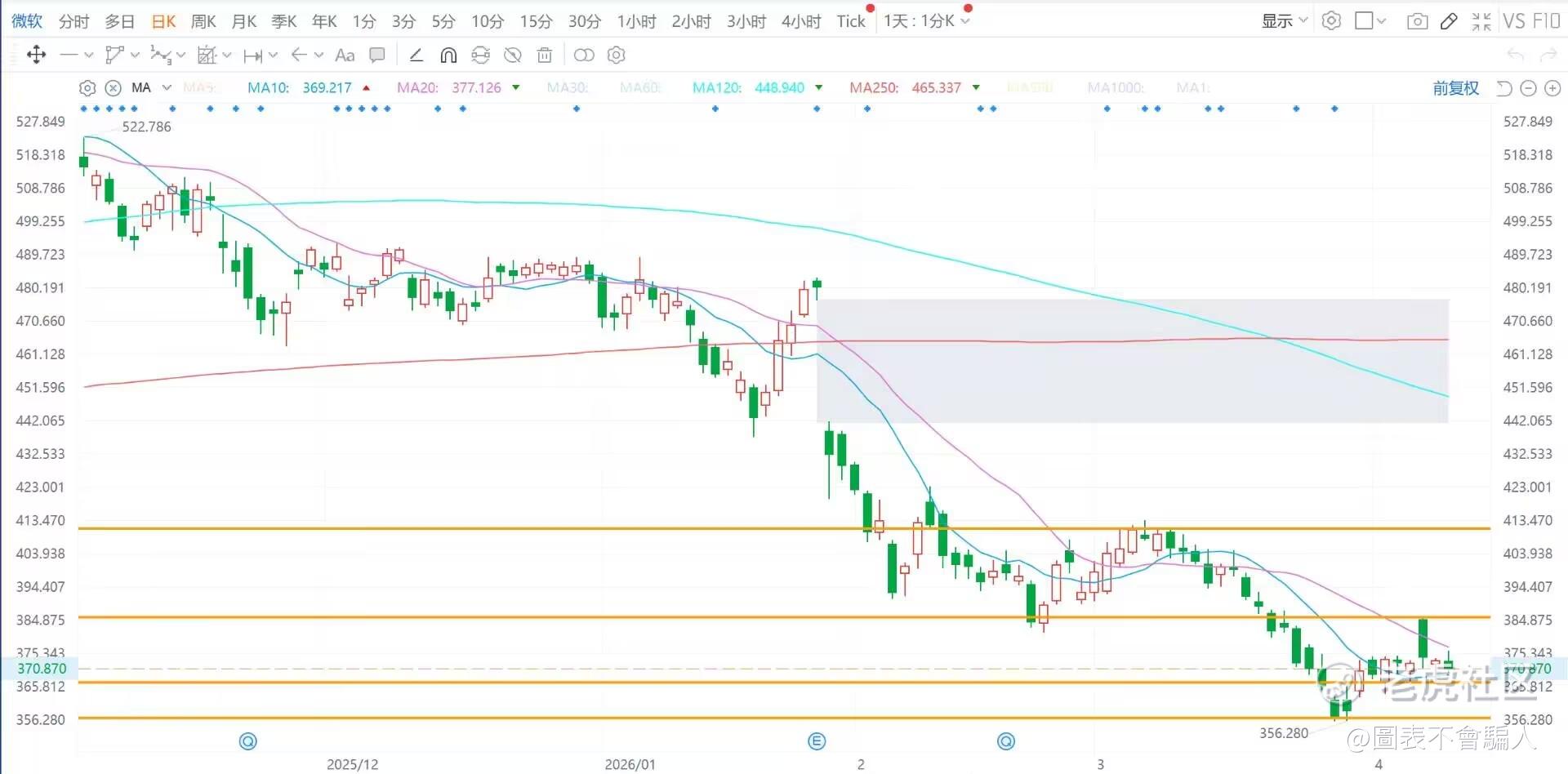 微软(MSFT):收跌0.59%,一路下行后进入区间震荡,支撑参考356/366,阻力参考385/410