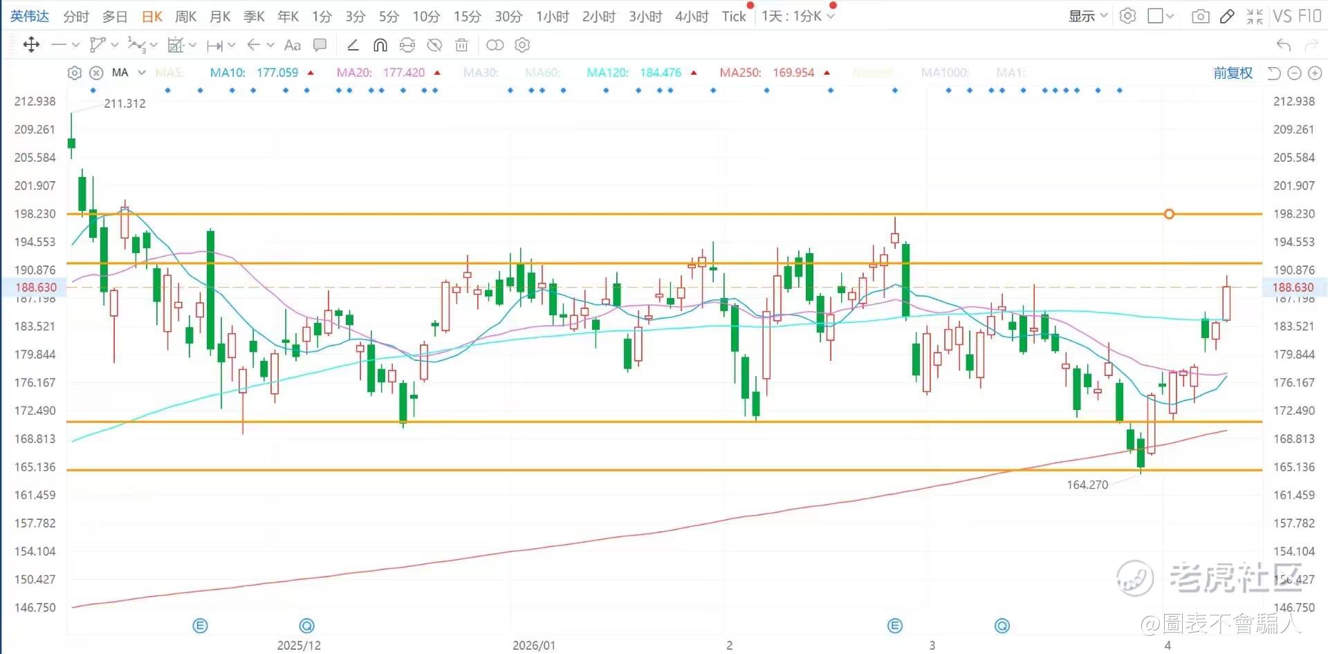 英伟达(NVDA):收涨2.57%,盘前跌0.97%,前段时间有触底反弹上行趋势,近期华尔街放出利好科技股建议,但是受国际局势变动影响盘前小跌,支撑参考164/171,阻力参考191/198