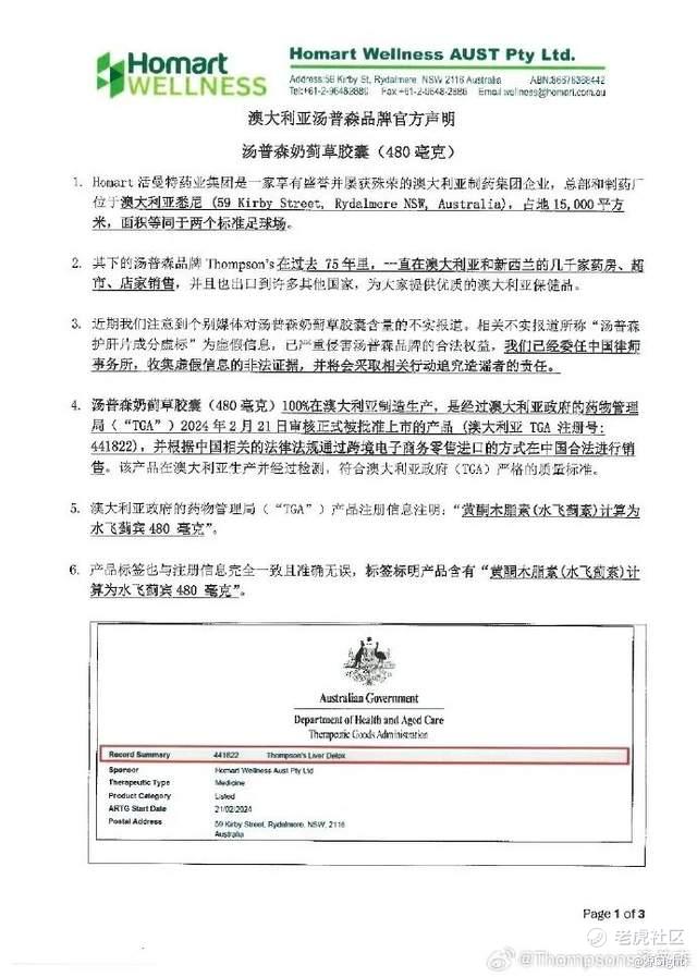 4月11日,汤普森再度发布官方澄清,并附上了通过TGA认证的澳大利亚实验室检测结果,显示产品的水飞蓟宾含量在479.9-489.7mg/每粒。