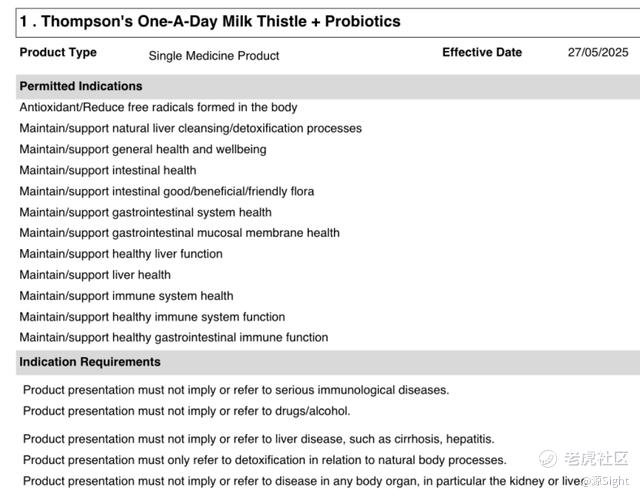 源Sight查询了汤普森水飞蓟产品在TGA的备案信息,其允许声称的功效是抗氧化、维持/支持肝脏自然清洁/排毒过程、维持/支持肝脏健康,其中产品展示要求不得提及暗示药物/酒精。